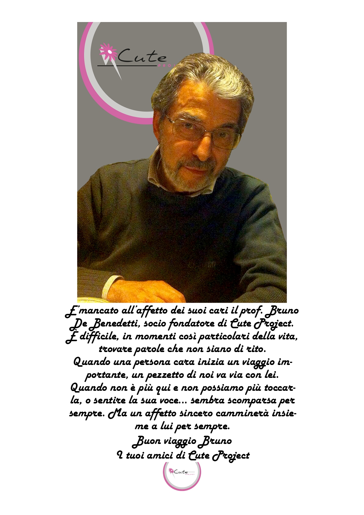 Il Professore De Benedetti ha sempre lavorato perché gli operatori sanitari potessero svolgere il proprio lavoro nelle migliori condizioni possibili. E in questi anni si è occupato,con dedizione e scrupolosità, della parte organizzativa e politico-diplomatica di Cute. Con la sua grande esperienza si è dedicato alla ricerca di fondi e alla collaborazione con altri gruppi di volontariato, creando meravigliosi rapporti di amicizia cooperativa. Da molti anni inoltre seguiva ragazzi con problemi di salute in aree in via di sviluppo, incarnando così una reale differenza di vita e di speranza per i suoi figli adottivi a distanza. Ci mancheranno infinitamente la sua pungente intelligenza, il suo equilibrio, la sua illuminata pacatezza risolutiva.