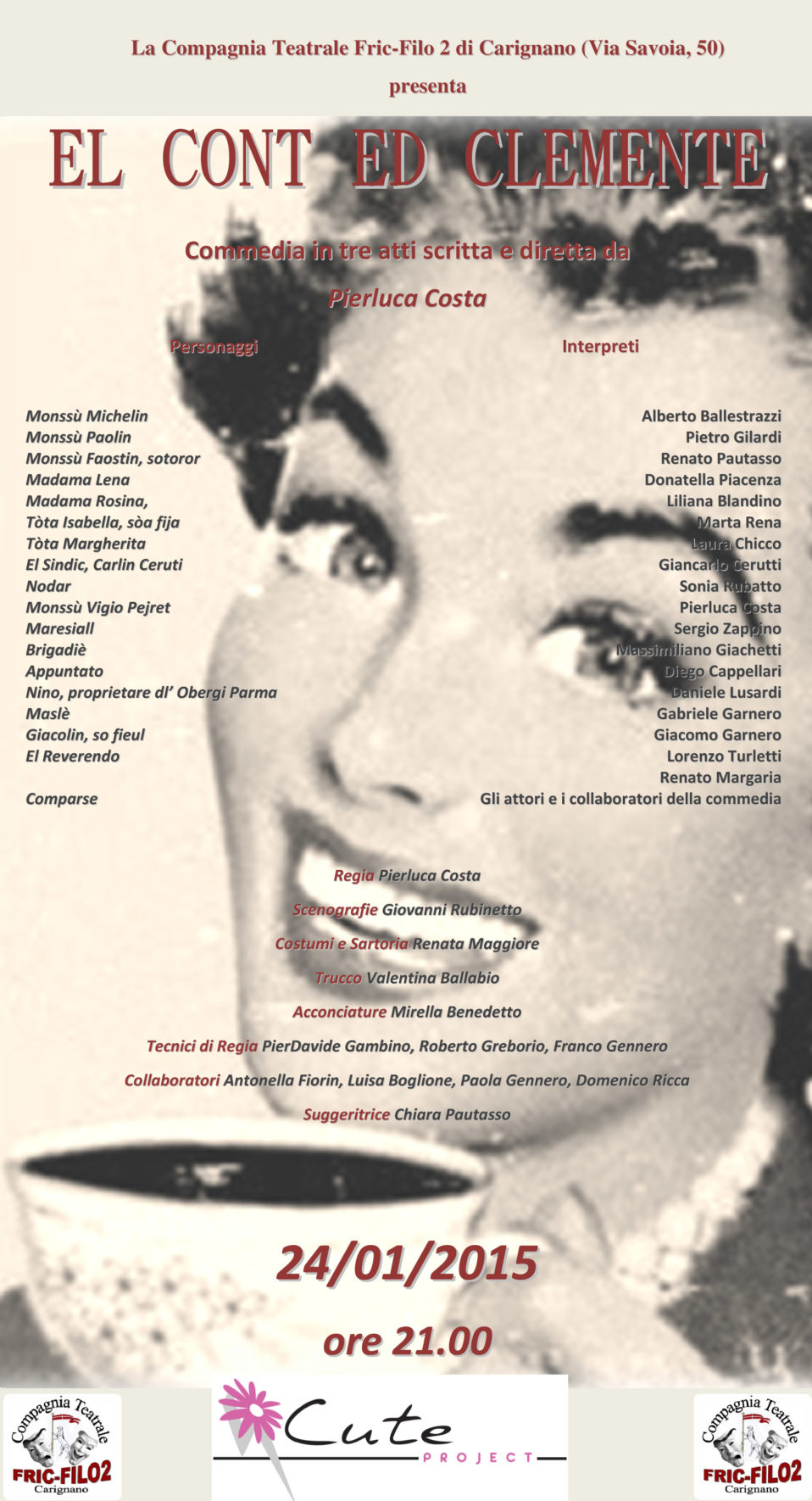 Sabato 24 gennaio si è svolta a Carignano, presso il Teatro della Compagnia Teatrale FRIC-FILO 2, una bellissima commedia in tre atti “ EL CONT ED CLEMENTE”, ambientata nella cittadina piemontese nel 1954, scritta, diretta ed interpretata da Pierluca Costa.