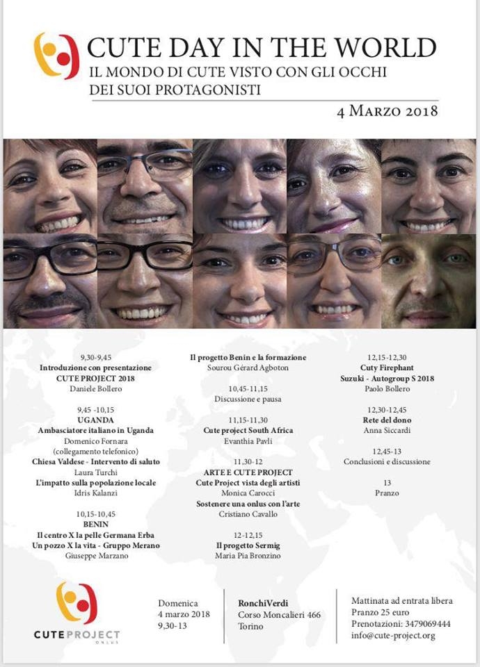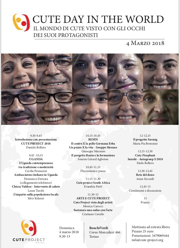 Parteciperanno: la Chiesa Valdese; il chirurgo ugandese Dr Edris Walala Kalanzi, che per il terzo anno consecutivo trascorre in Italia un periodo formativo con una borsa di studio targata Cute e ci parlerà dell’impatto sulla popolazione locale di Cute a Fort Portal; Giuseppe Marzano del Gruppo Missionario di Merano che ci parlerà del centro per la pelle Germana Erba che stiamo cercando di realizzare in Benin e de il progetto Un pozzo per la vita; il chirurgo beninese Dr Sourou Gérard Agboton che collabora con noi in Benin a N’Dali da 3 anni, ci illustrerà il progetto Benin e la formazione; dal Sud Africa ci raggiungerà Evanthia Pavli, terapista occupazionale, che insieme a Roxane Wentzel viaggia con noi in Benin e Uganda per formare il personale locale sulla parte riabilitativa per il trattamento delle persone ustionate; per il rapporto con arte e artisti e volontariato interverranno l’artista Monica Carocci, l’ingegner Cristiano Cavallo di Collezionissima e Luca Barsi della Galleria Accademia di Torino; ci parlerà del progetto Sermig, dove continua l’ambulatorio di Cute La plastica è per tutti, la Dr Maria Pia Bronzino con Andrea Zampollo; sul progetto Cuty Firephant interverrà Suzuki Italia 2018; Anna Siccardi della Rete del dono con cui collaboriamo ci racconterà come “Ogni occasione è buona per sostenere una buona causa: cosa vuol dire diventare personal fundraiser” e potrete acquistare al nostro stand la t-shirt cute con cui aderire al dress-code per la mezza maratona di Torino del 18-3-18 come runner o camminatore.