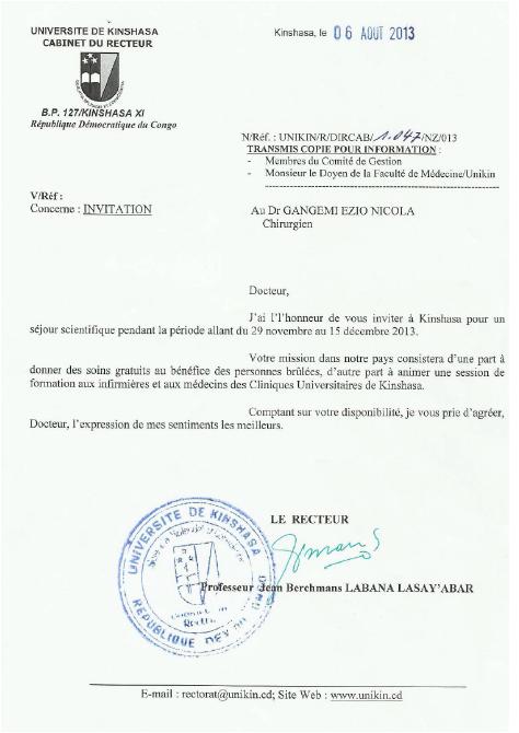 Lettera di invito Ministero della Sanità Pubblica Congolese